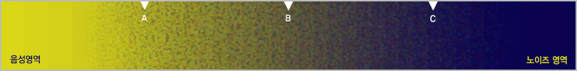 모든 소리는 위 그림에서 보시는 것처럼 음성과 노이즈 영역의 경계가 매우 불분명하게 섞여 있는 상태여서 A, B, C 지점 어느 하나를 기준으로 단순하게 노이즈를 감쇄작업을 수행한다면 필연적으로 음의 왜곡(A지점)이 발생하거나 공명(B지점) 또는 감쇄 효과가 미미(C지점)한 상황이 발생하게 됩니다.